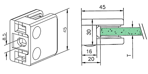 Zinc Alloy Flat Back square clamps for glass balustrades. Suitable for flat post, walls, and floors. Clamps complete with gaskets and reinforced screws. M8 interface fixing screws not provided.