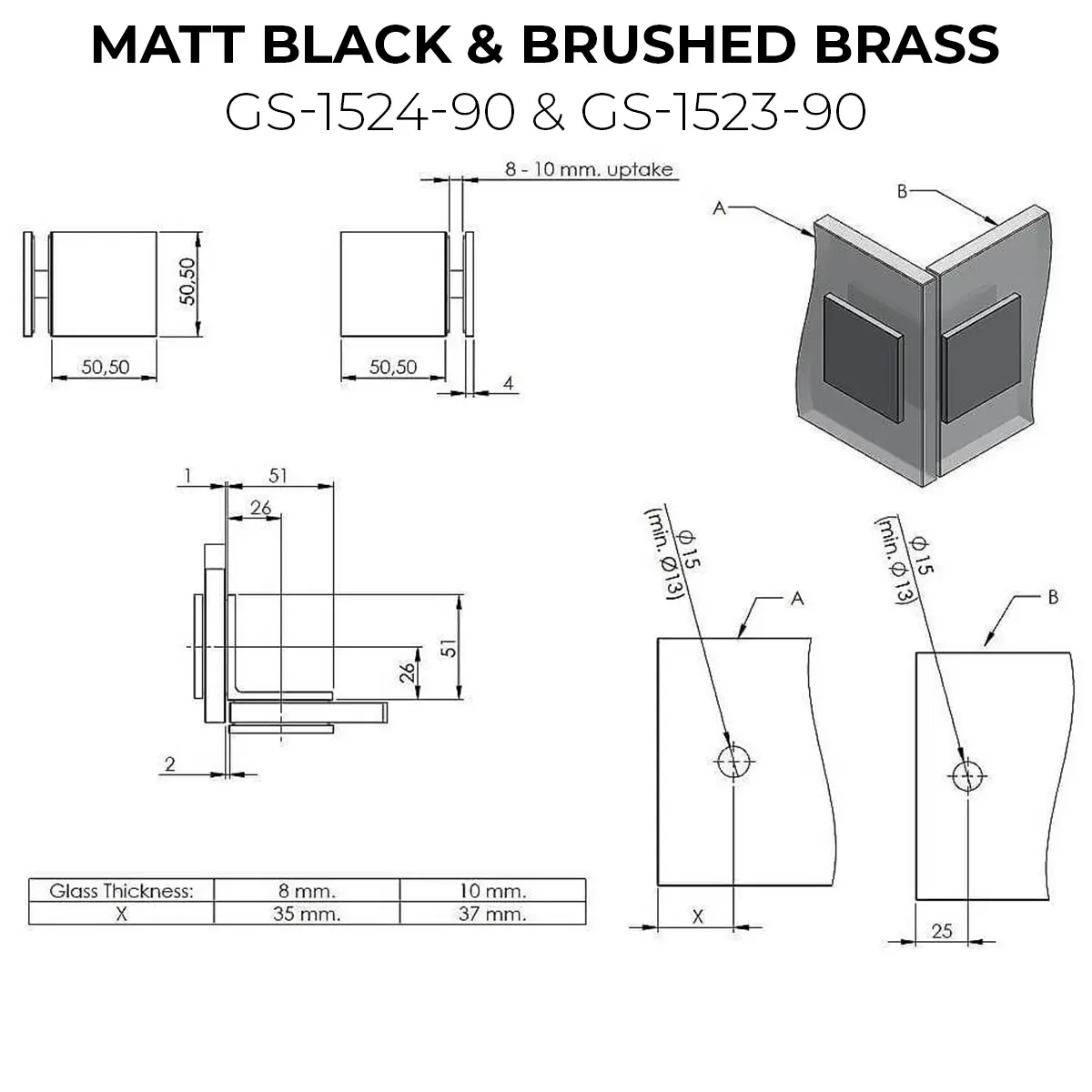 Square glass to glass bracket, suitable for 8mm – 10mm shower screens and partitions.