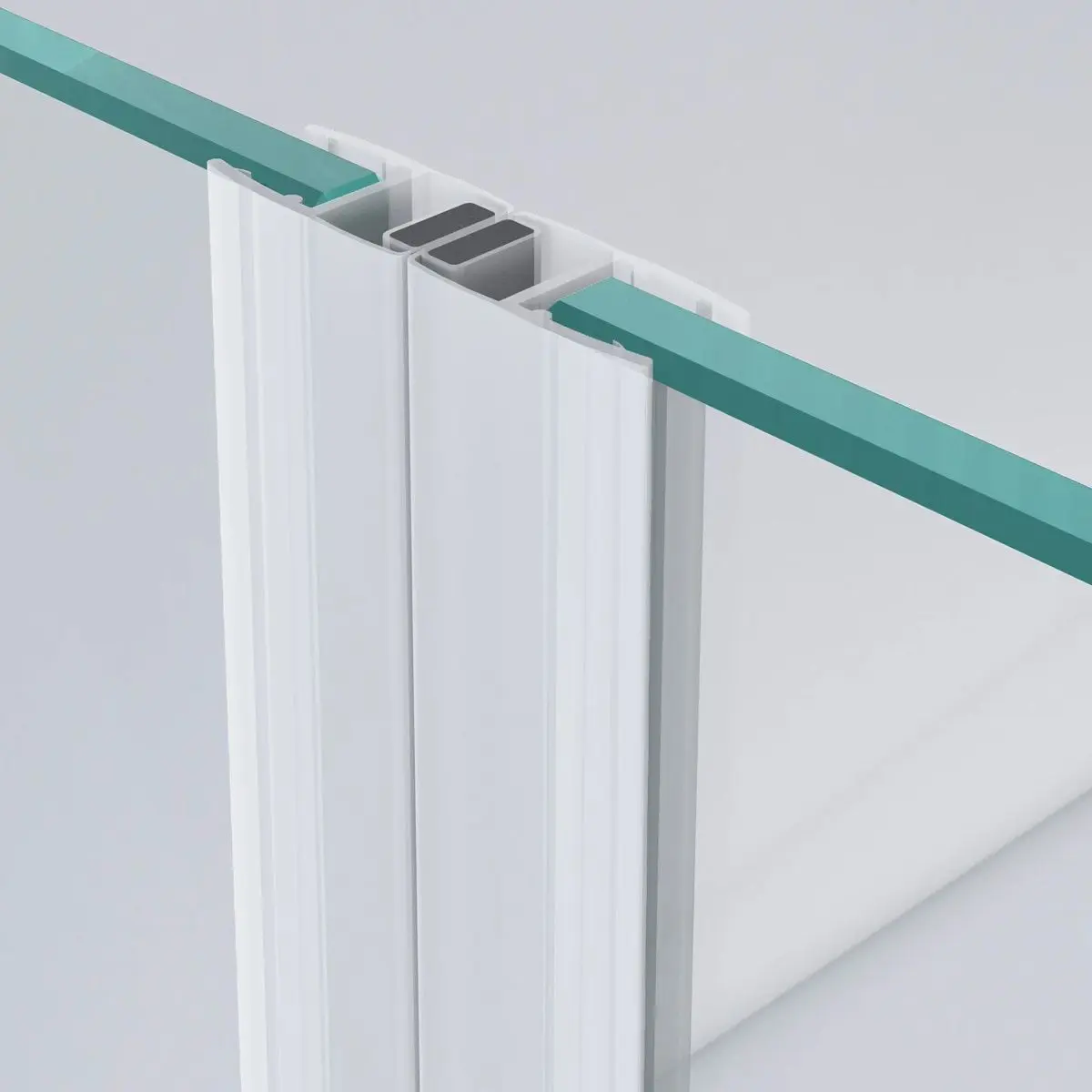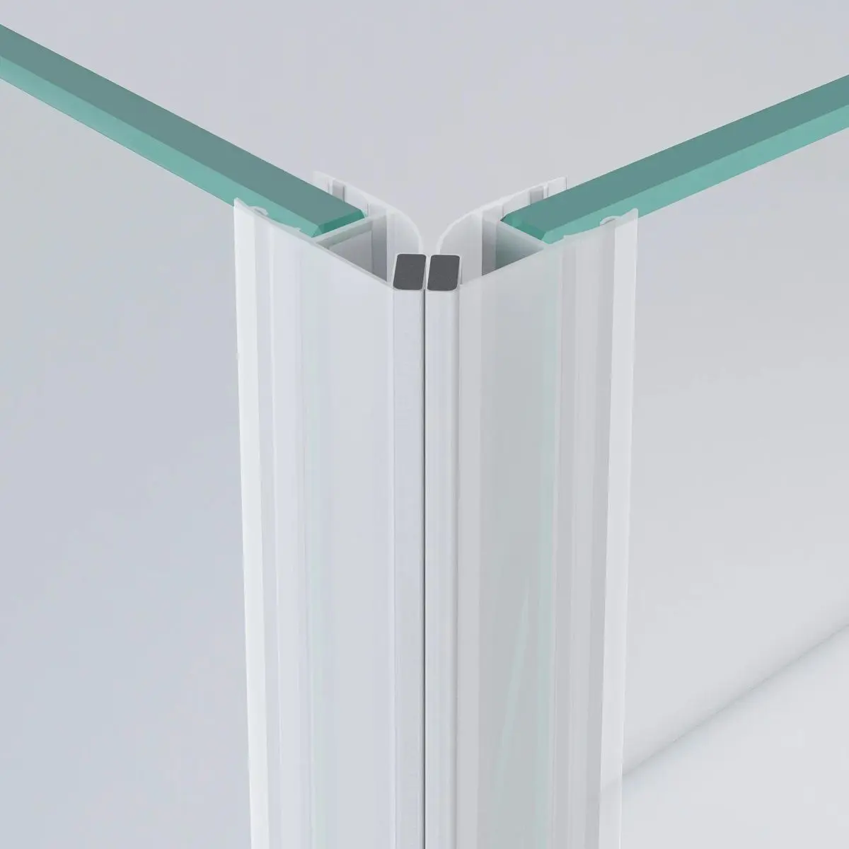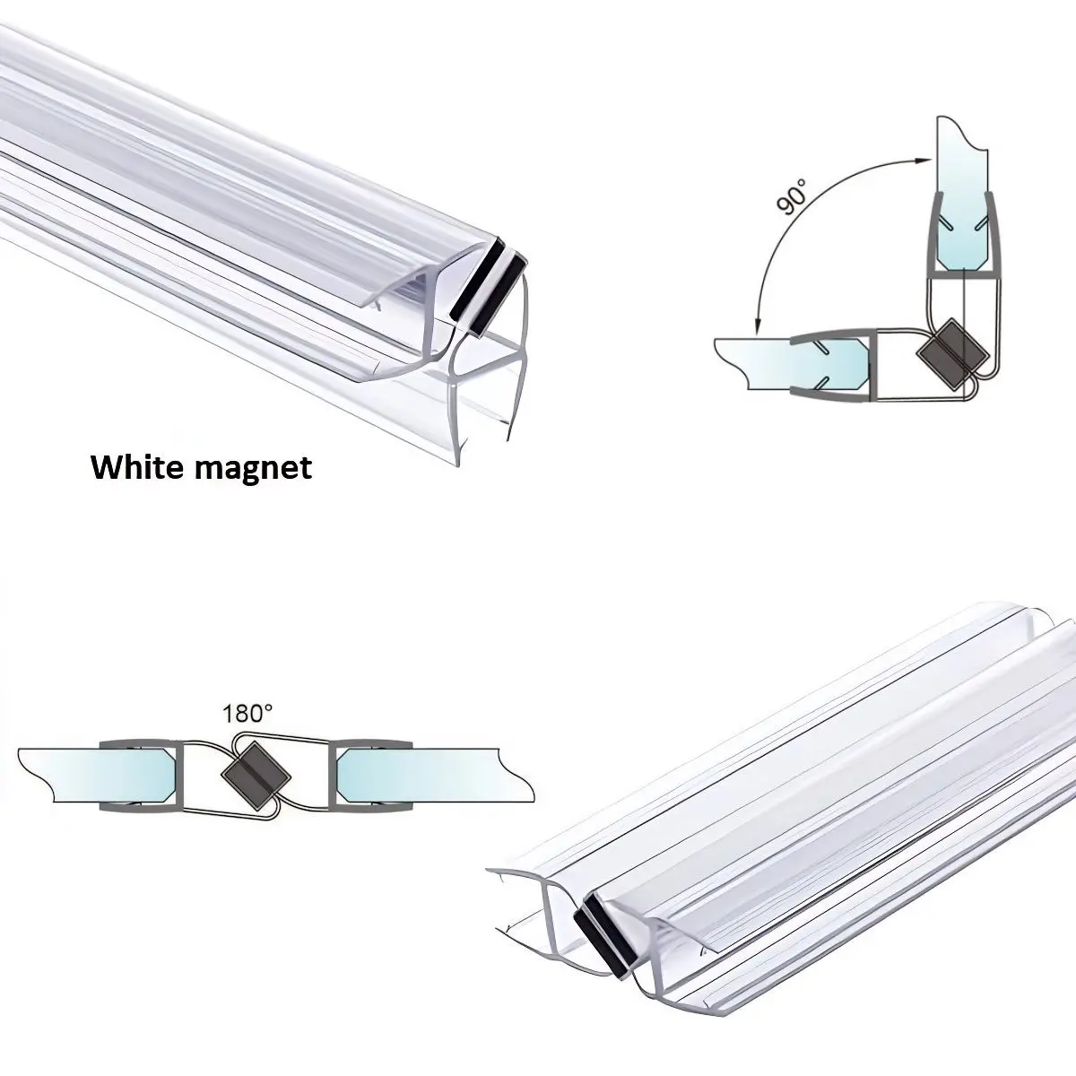 Translucent glass to glass magnetic seals for use between the edge of the shower door and the adjacent fixed glass panel jointed at 90° (door to open outwards only) or 180° (door opens one way only). The 45° white magnet strips join together to make 90° or 180° angles.