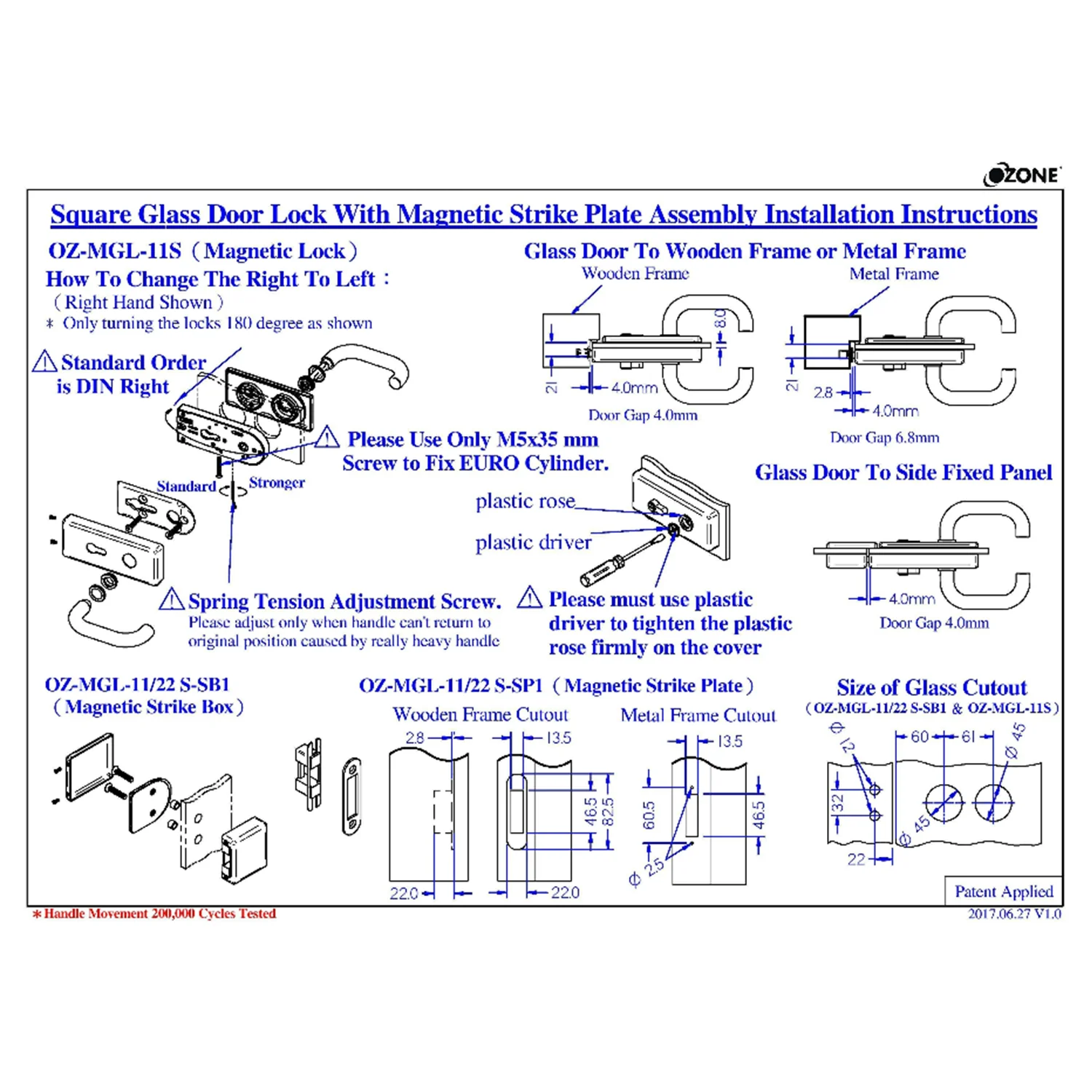 - Contents: Comes with a lever latch body, handle set pair (return style), magnetic strike options, and detailed instructions.